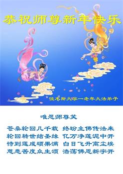 长春高校大法弟子给慈悲伟大的师尊拜年!恭祝慈悲伟大的师尊新年快乐!感恩师尊的慈悲苦度!盼望师尊早日回归故乡。 在新的一年里,我们一定珍惜修炼机缘,利用各自的条件讲清真相,加强整体配合,做好三件事,多救人,跟上正法進程,让师父多一些欣慰,少一些操劳。 江苏扬州市扬州大学青年大法弟子恭祝师尊新年好!