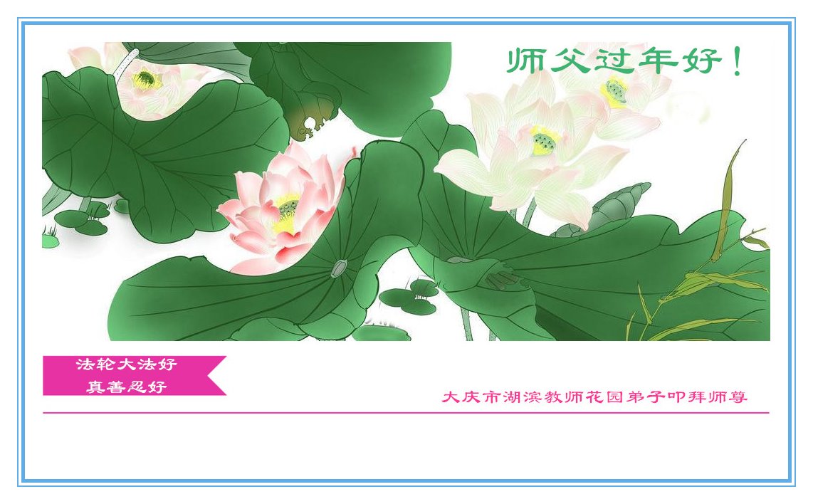 感恩师尊的慈悲救度。弟子一定要精進实修自己,放下所有人心,走好修炼的路,圆满随师还。 盘锦市辽河油田采油厂三位大法弟子 中国大陆税务系统大法弟子恭祝师尊过年好!