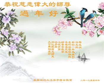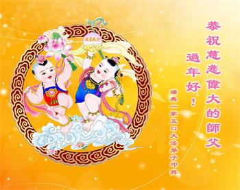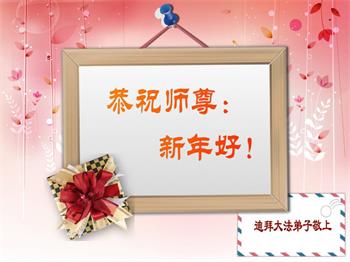 师尊您好!师尊辛苦了!新年佳节弟子叩谢师尊! 在这喜悦的新年到来之际,弟子心怀崇高的敬仰和无限感恩的心给最最伟大的师尊拜年!恭祝师尊过年好! 弟子遵从师尊的教诲,更加尽心尽力做好三件事,学好法,溶于法中,用法的标准衡量,向内找,主动的实修自己、提高自己,多救人。 师尊佛恩浩荡,给了弟子最好的一切,弟子为有伟大的师尊、慈悲无量的师尊而感到无比幸运、幸福。我们要加倍珍惜这万古机缘,更加精進,惟愿师尊笑! 加拿大温尼泊两位大法弟子敬贺 美国纽约大法弟子母女恭祝慈悲伟大的师尊过年好!