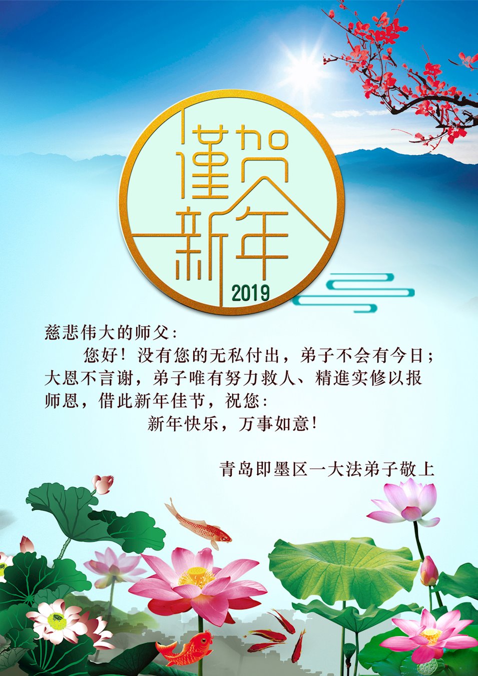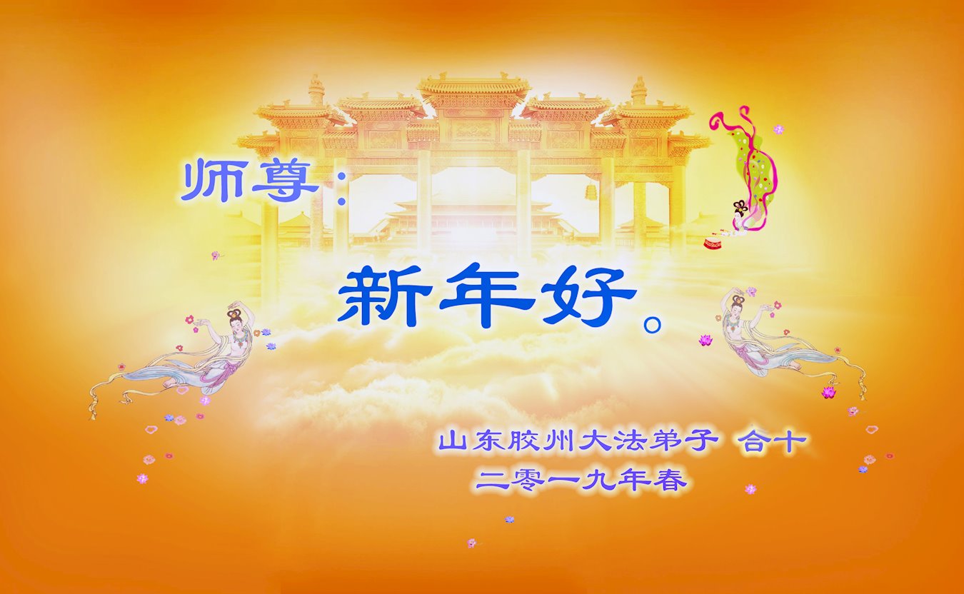 尊敬的师父您好!在新的一年里,弟子一定舍弃自我,做好三件事,修炼如初,圆满随师还。 城阳大法弟子叩拜师尊! 二零一九年一月二十七日 山东省青岛市胶州市大法弟子给师尊拜年!