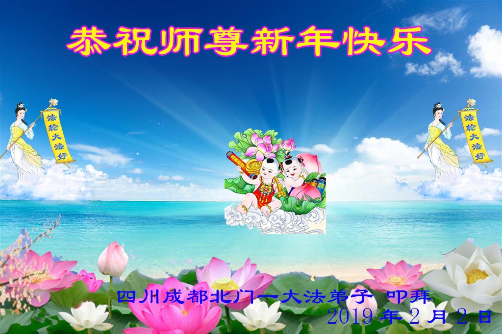 师尊您辛苦了!学法小组弟子恭祝师尊过年好! 我们一定精進实修,不辜负师尊的慈悲救度,做好三件事,圆满随师还。 成都南门学法小组弟子叩拜师尊过年好! 2019年2月3日 四川成都市一青年大法弟子恭祝师尊新年快乐!