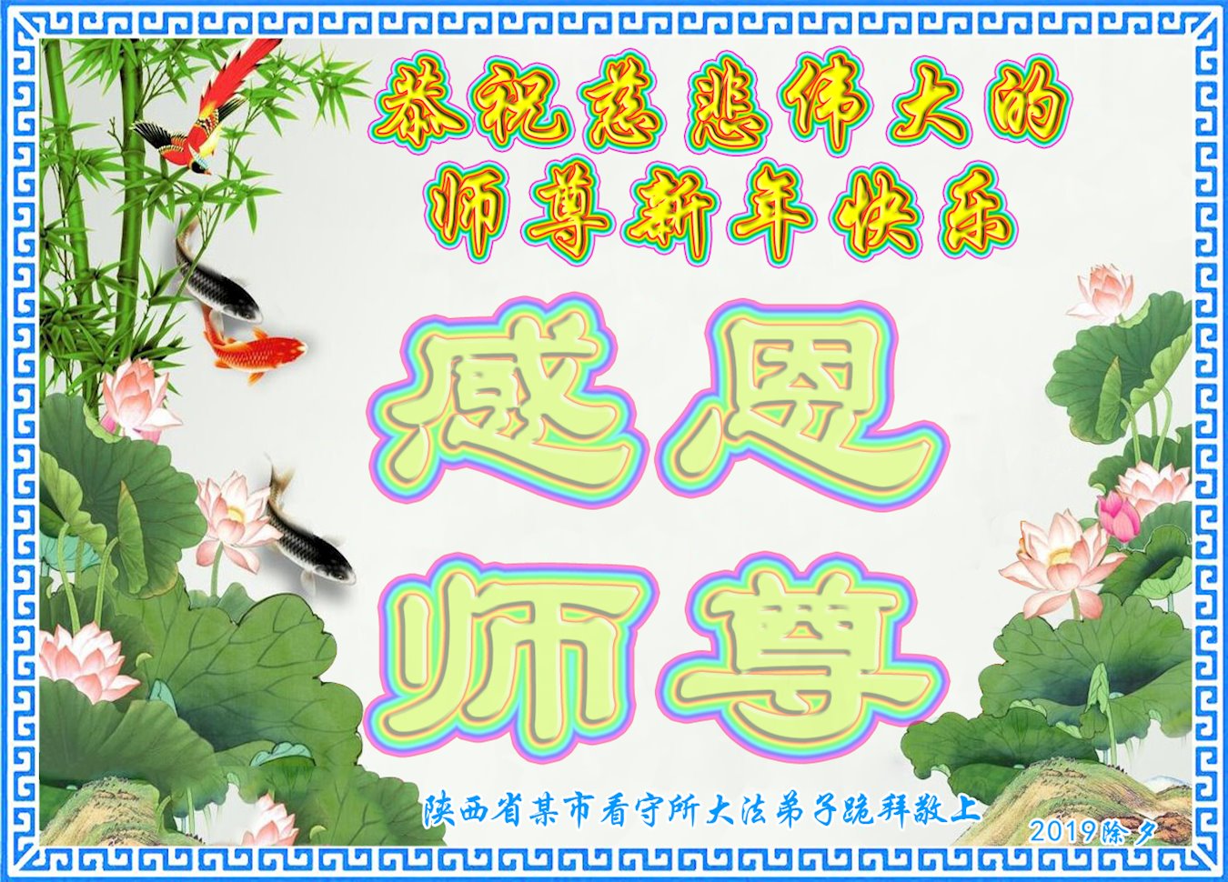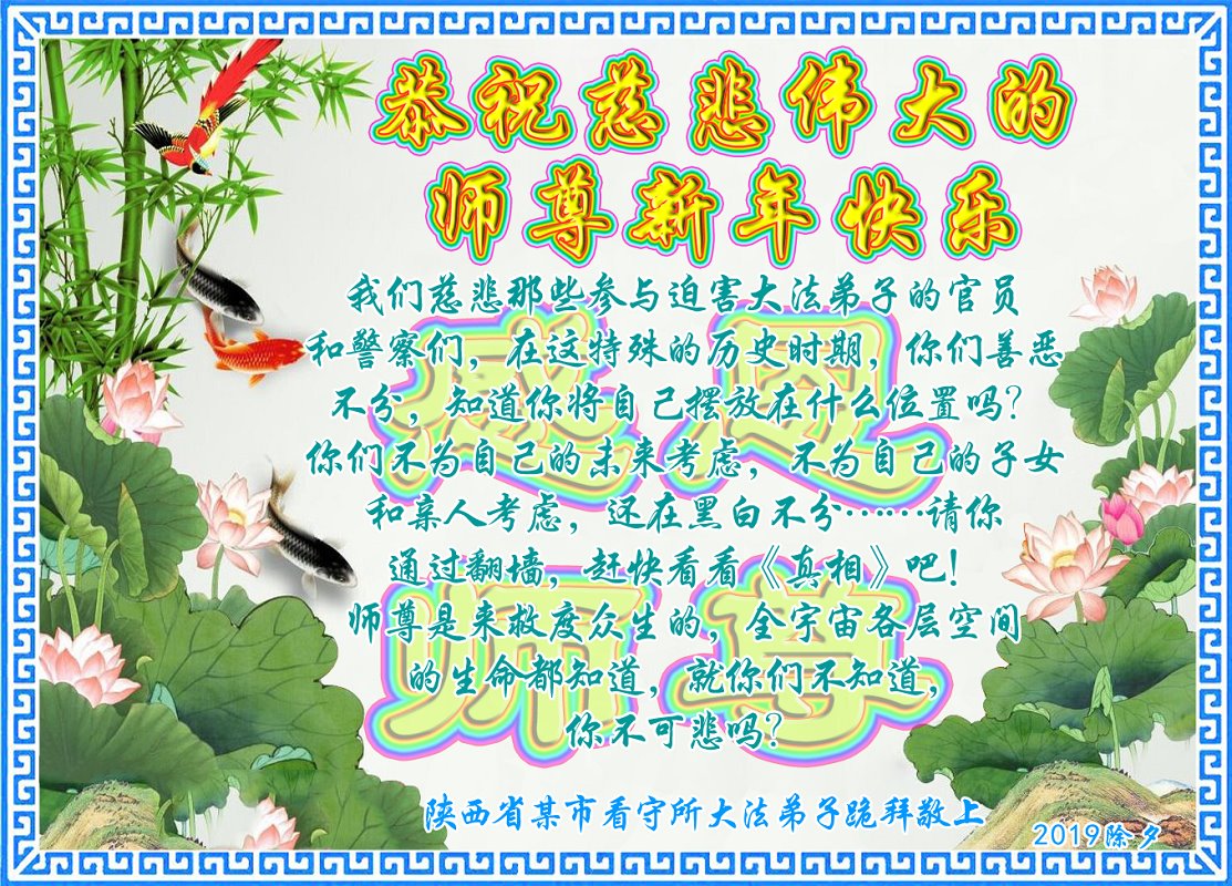 恭祝慈悲伟大的师父过年好! 山东省临沂市临沭县全体大法弟子、被非法关押在监狱的大法弟子恭祝师父新年快乐!