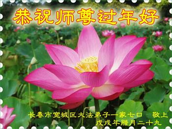 我谨代表我们一家三口人以及吉林省农安县大法弟子向慈悲伟大的师尊恭祝新年快乐!在新的一年里,全县弟子一定不负师尊的慈悲救度,认真学好法,炼好功,精進做好三件事,圆满随师还家。敬请师尊放心! 吉林省长春一大法弟子恭祝慈悲伟大的师父新年好!