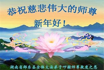 湖南岳阳市君山区全体大法弟子恭祝慈悲伟大的师尊过年快乐! 一年一年又一年 二零一九瞬光临 弟子感恩叨不尽 点点滴滴铭心间 大事小事定分寸 一寸时光一寸金 抓紧做好修炼事 救人抢人摆在先 闯关降魔破风险 越到最后越精進 众徒叩谢师尊恩 唯拜师尊乐新年 二零一九年一月二十四日 湖南省邵阳市邵东县全体大法弟子向恭祝师父新年快乐!