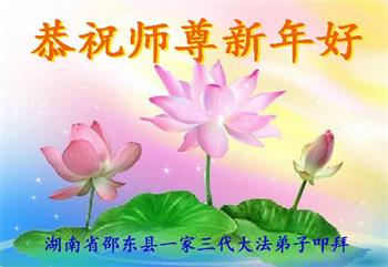 师父您好!师父辛苦了! 新年来临,弟子们叩谢师父慈悲苦度洪恩!感恩师父生生世世的慈悲看护。弟子们一定珍惜这万古机缘,努力精進实修,多做资料,多救众生,助师正法,愿师父多欣慰,少辛劳。 湖南二位大法弟子及家人恭祝师尊新年快乐!