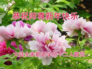 大陆全家新老学员十二人恭祝师尊新年快乐!感恩师尊救度之恩,是您“真善忍”的法理指导我们做好人,是您神奇的功法使我们全家人得到健康身体。在这新年来临之际,我们全家表达对您的感恩!盼望您早日回到大陆。 全世界大法弟子恭祝慈悲伟大的师尊过年好!师尊辛苦了!
