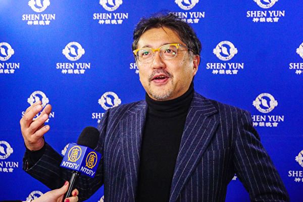 演出中所呈现中国多民族舞蹈的服饰、色彩和设计,让她赞叹,“鲜艳、漂亮,在日本极为罕见。” 前读卖编辑主任:把中国辉煌历史的思想传递出来  图12:二月五日,日本资深媒体人、前读卖新闻社会部编辑主任南隆洋观(Takahiro Minami)看了神韵世界艺术团在日本福冈市的演出。 |