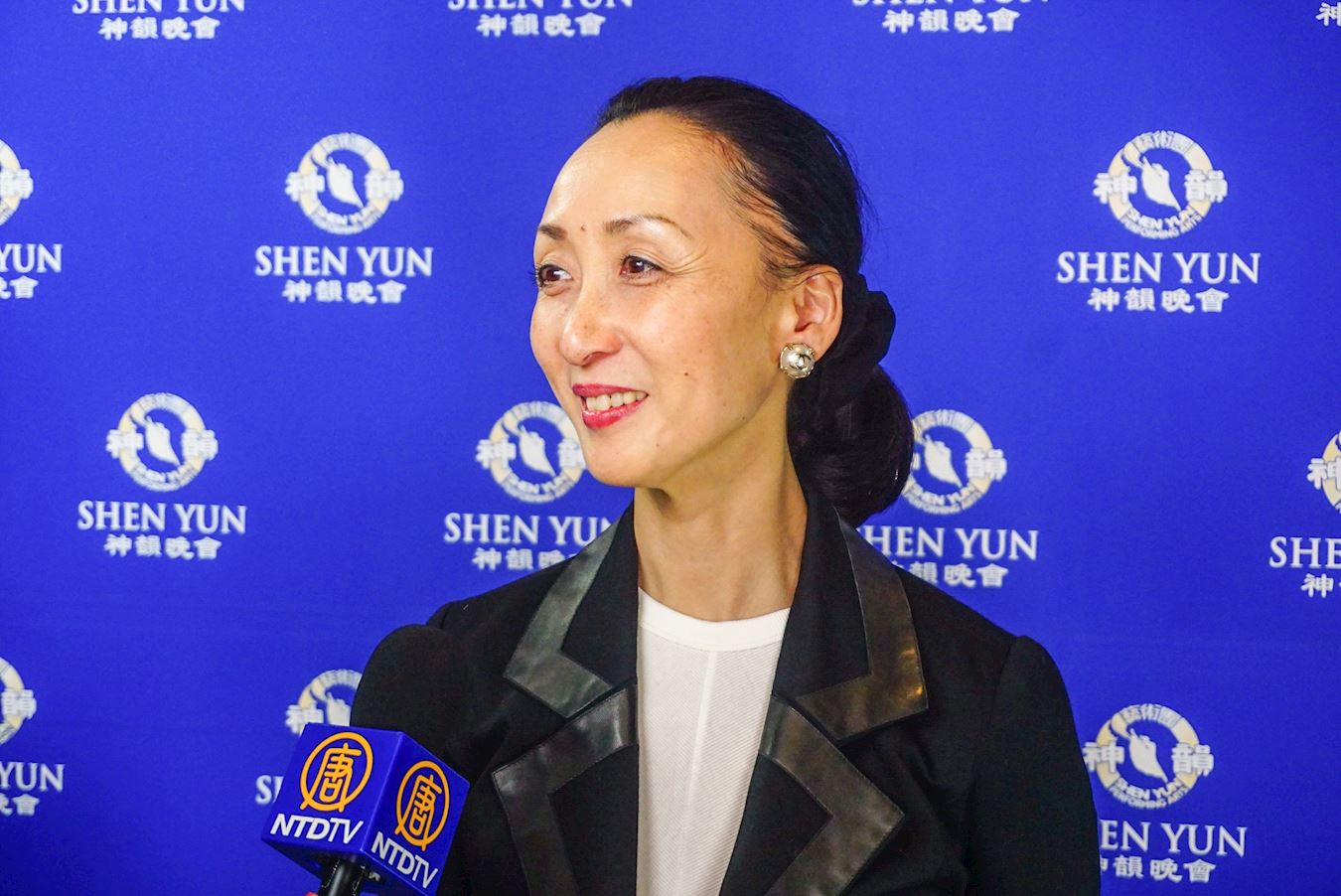 “肢体动作富有‘表情’,我却能清楚听到声音,那是心灵之声。”身着淡雅蓝色和服的田中掩不住心中的喜悦:“舞姿优美,轻盈飘逸,不论从表情到指尖以致脚部,妙不可言。” “心灵获得洗涤,感受回到摇篮中的纯真,这种体验前所未有。”她说,连自己的心也随着歌声起伏:“声音也成为身体的一部份,歌唱家传统美声唱法,声音纯正,悠扬淳朴,好像谆谆的教诲。” 富士制作所社长:超乎想象 日本富士制作所公司社长村上友里惠观看一月二十二日日本大阪欧力士剧场(ORIX THEATER)神韵演出后相当啧啧称奇:“首次观赏神韵,让从未接触过中国古典舞的我感到意外惊喜。”“看得非常愉快!当大幕一拉开,就完全忘我地陶醉了。”“辉煌、艳丽、壮观,超乎我的想象!”  图11:村上友里惠观赏神韵后,感到意外惊喜,连叹:“辉煌、艳丽、壮观,超乎我的想象!” |