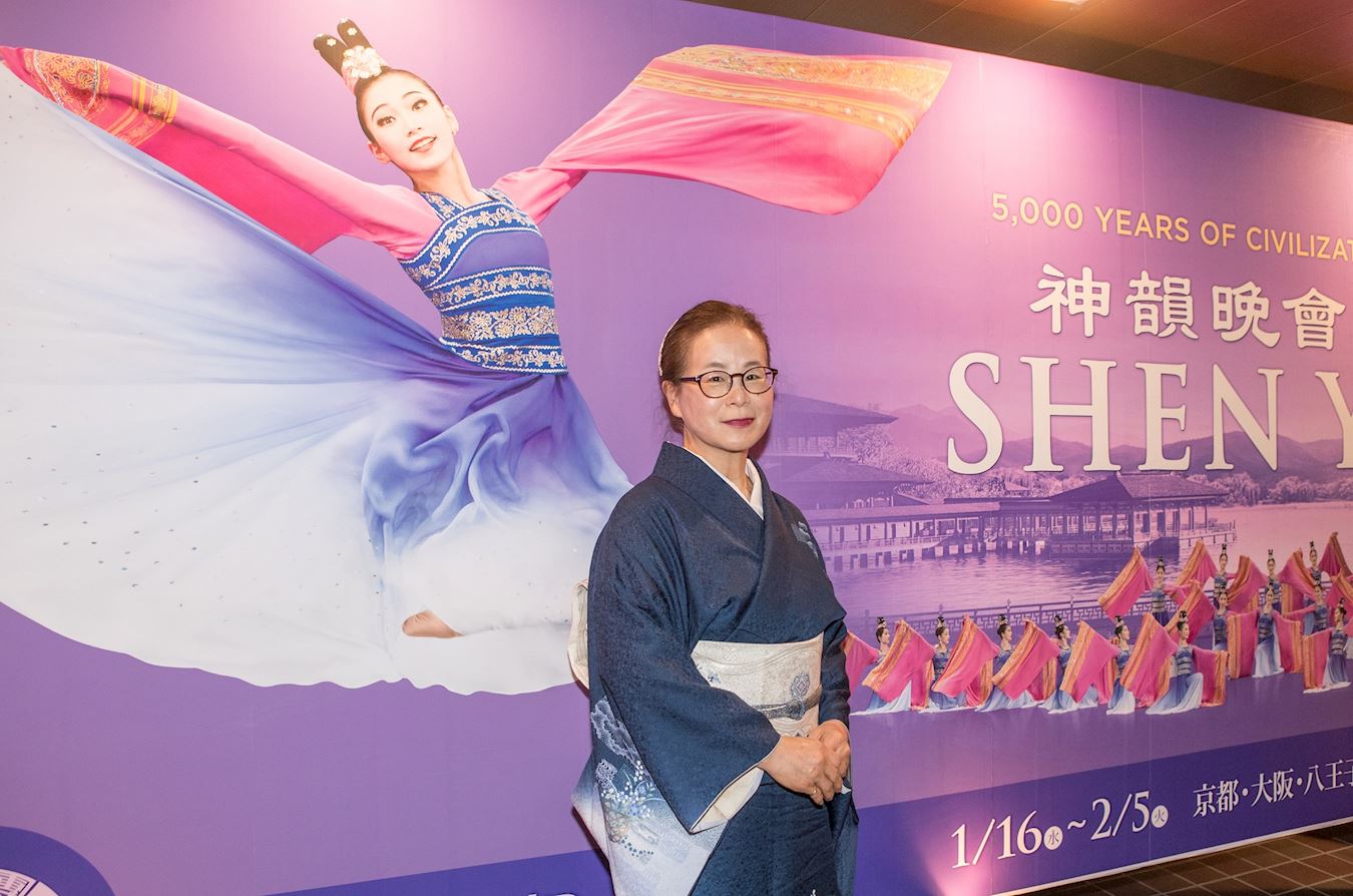 从歌唱家演唱,舞台上舞动的演员、动态天幕、交响乐伴奏,整体的艺术效果,都让她感受到强而集中的能量,色彩绚丽灿烂,入山AKI子表示,“这能量激励我更加努力,这一切都让我感动。太了不起!演出令我振奋,让我看到生活的希望,给了我面对未来更加努力的动力。” “神佛下世救度人间于危险时刻的一幕,令人感动。那一幕提醒我,人不仅顾自己,不管什么时候都要尽量去帮助他人,今后我会更加努力。演出也让我再一次认识到,人与人之间一定要互相尊重,互相体谅。” “谢幕时,艺术家一个一个的出来跟观众致谢,我这才发现有那么多人。感觉他们是一个整体,每一个人都超凡脱俗,每一位都用了百分之百以上的力气为观众演出,真是太了不起了!” 日本舞老师:感受无声的心灵之音  图10:首次观赏神韵的田中碧(Midori Tanaka)女士,在日本NHK的文化节目中教授日本传统舞。一月十七日观赏完Romh京都剧院的第二场演出步出剧院时仍满怀欣喜。 |
