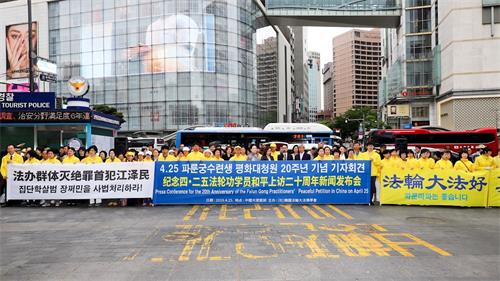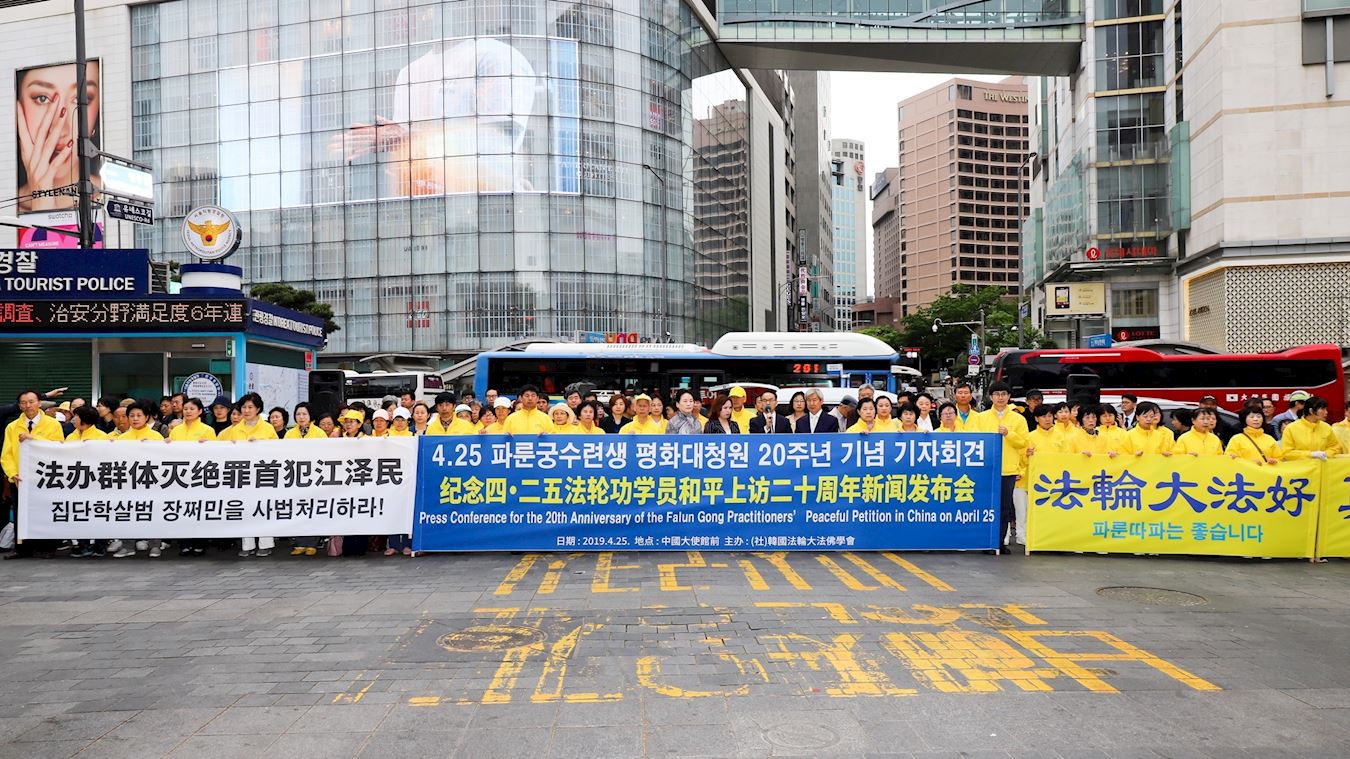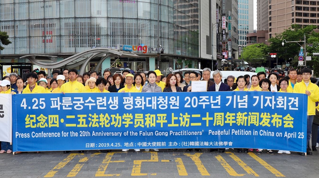 图3:二零一九年四月二十五日上午,法轮功修炼者在釜山中国领事馆前召开纪念“四·二五和平上访”二十周年新闻发布会。 |