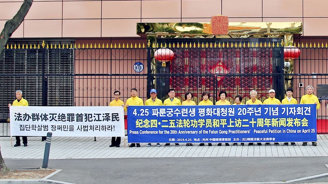 图4:二零一九年四月二十五日上午,法轮功修炼者在光州中国领事馆前召开纪念“四·二五”二十周年新闻发布会。 |