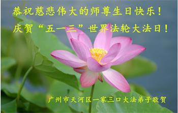 普天同庆世界法轮大法日! 广州市越秀区一学法小组全体大法弟子恭祝师尊生日快乐! 广东省广州市天河区一家三口大法弟子恭祝慈悲伟大的师尊生日快乐!