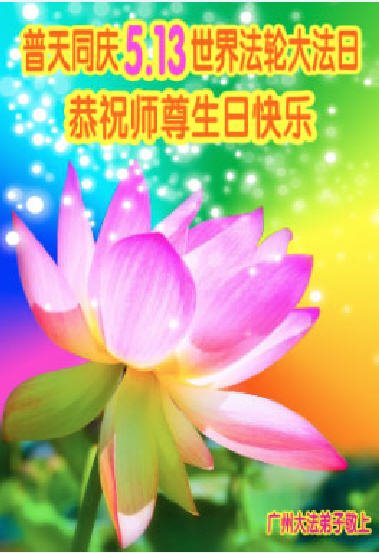 师尊您好!师尊您辛苦了!感谢师尊慈悲救度!感谢师尊慈悲保护!弟子唯有精進才能不负师恩。弟子叩谢师尊!广州大法弟子恭祝慈悲伟大的师尊生日快乐!庆贺世界法轮大法日! 广东省广州市大法弟子恭祝师尊生日快乐!普天同庆5.13世界法轮大法日!