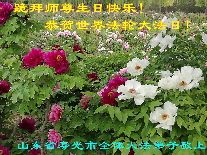 二零一九年法轮大法日到来之际,恭祝师父生日快乐!我们夫妻二人在今后的日子里更加精進扎扎实实做好三件事,请师父放心。 高密市西北乡夫妻二位大法弟子敬上 二零一九年四月二十七日 山东省潍坊市高密市西北乡一学法小组大法弟子恭祝慈悲伟大的师父生日快乐!庆祝5.13世界法轮大法日!
