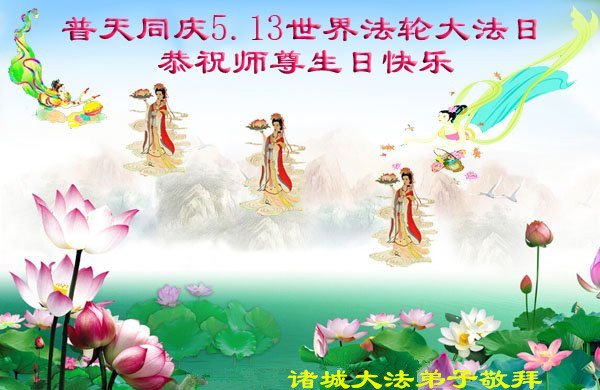 我们姐妹俩大法弟子恭祝师父生日快乐!谢谢师父的操劳保护,请师父放心,我们修好自己多救人做好三件事。 山东省潍坊市高密市西北乡一大法弟子庆祝5.13世界法轮大法日!恭祝慈悲伟大的师父生日快乐!