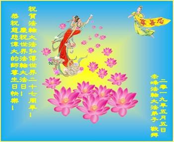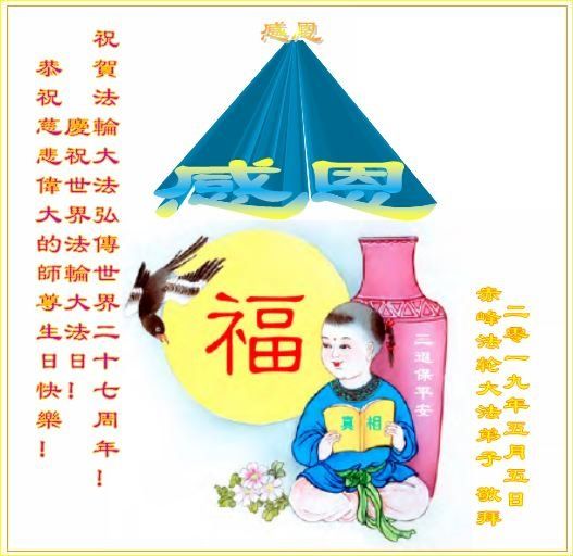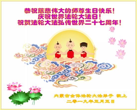 【明慧网二零一九年五月十一日】 内蒙古伊敏在外地的夫妻大法弟子恭祝师尊生日快乐!及恭贺世界法轮大法日!