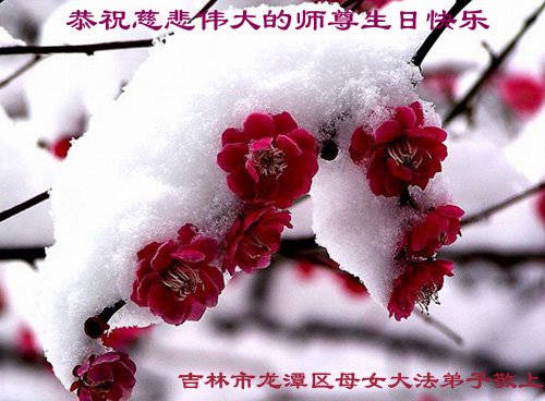 庆祝世界法轮大法日! 吉林市龙潭区母女大法弟子感恩伟大师尊的慈悲苦度!弟子会象傲雪的梅花一样,达到法对我们的要求。弟子跪拜师尊,祝师尊生日快乐!