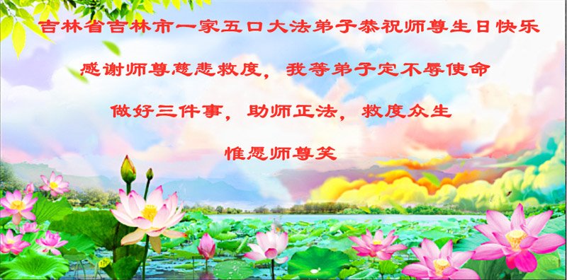 吉林省吉林市一家五口大法弟子恭贺世界法轮大法日!感谢师尊慈悲苦度!我们弟子一定不辱使命,做好三件事,助师正法,救度众生,惟愿师尊笑! 吉林省吉林市大法弟子虔诚敬贺师尊华诞暨世界法轮大法日!