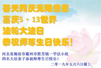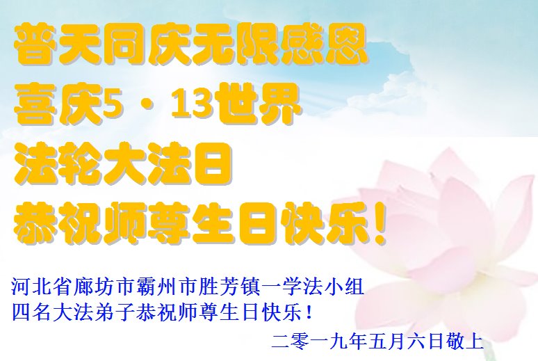 普天同庆 无限感恩 喜庆5·13世界法轮大法日! 恭祝师尊生日快乐! 河北省廊坊市霸州市胜芳镇一学法小组四名大法弟子恭祝师尊生日快乐! 二零一九年五月六日敬上 河北省廊坊一学法小组大法弟子恭祝师尊生日快乐!庆祝513世界法轮大法日!