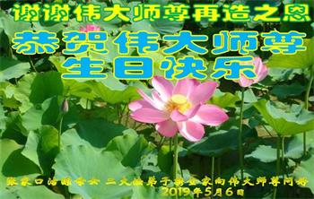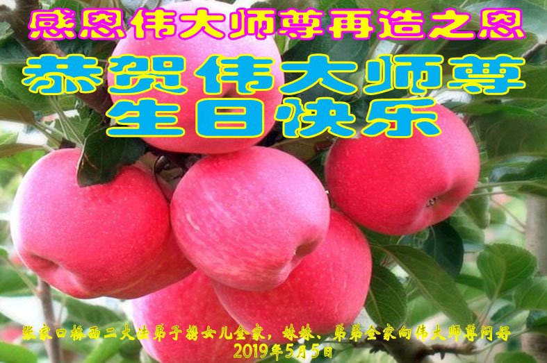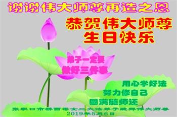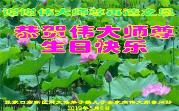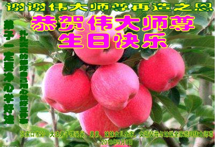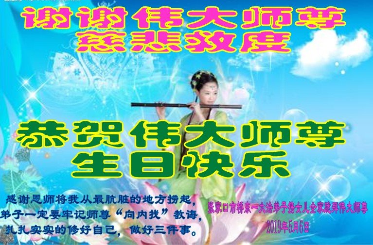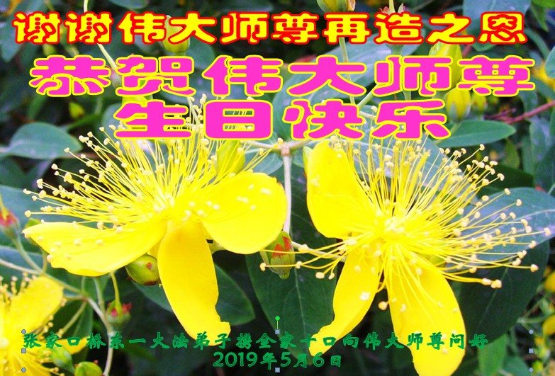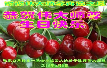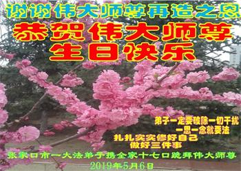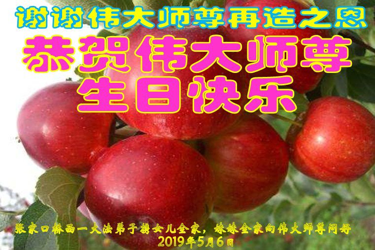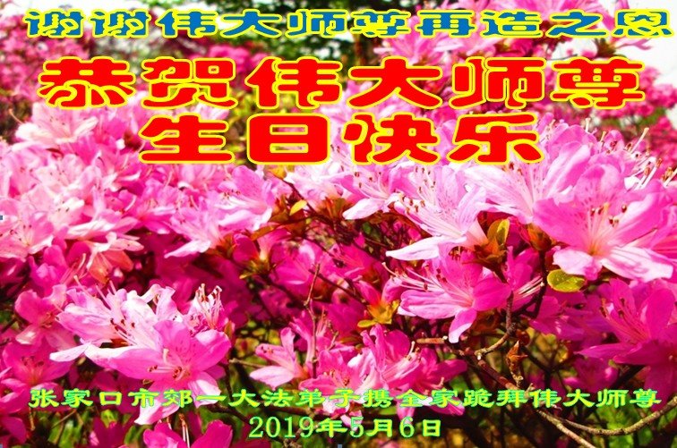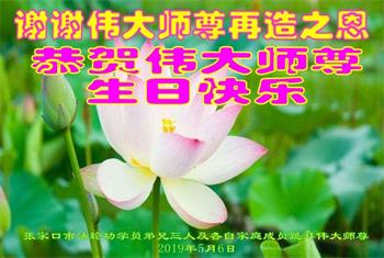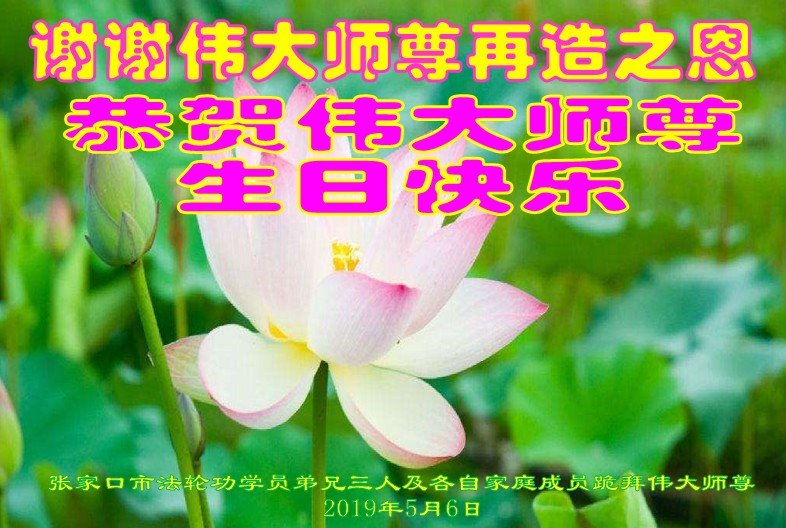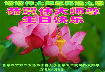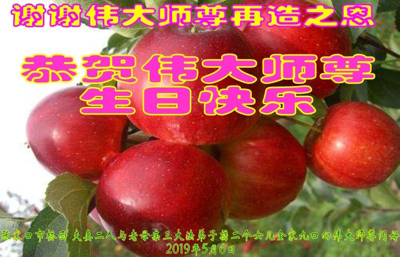 【明慧网二零一九年五月十一日】 河北省张家口法轮功学员弟兄三人及各自家庭成员祝伟大师尊生日快乐!谢谢伟大师尊再造之恩!