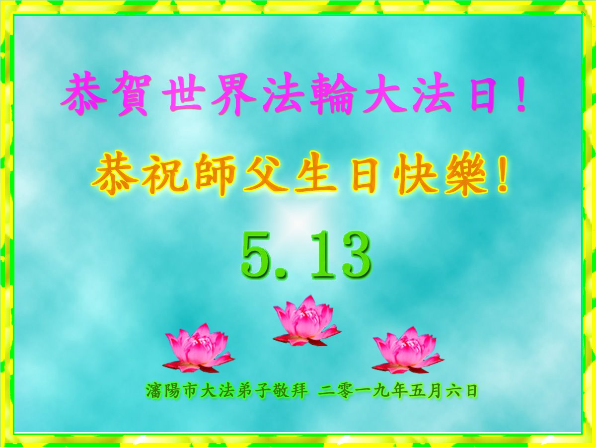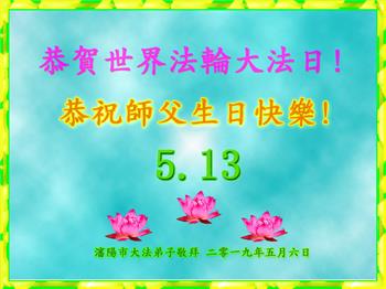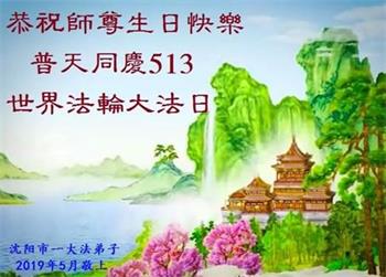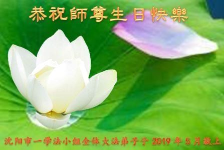 【明慧网二零一九年五月十一日】 辽宁省沈阳全体大法弟子恭祝师父生日快乐!同庆世界法轮大法日!