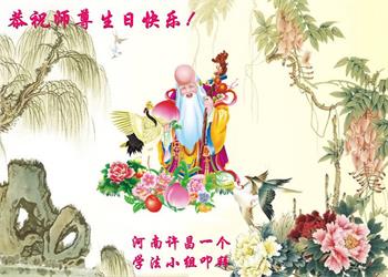 中国大陆河南周口一学法小组大法弟子恭祝慈悲伟大的师尊生日快乐!