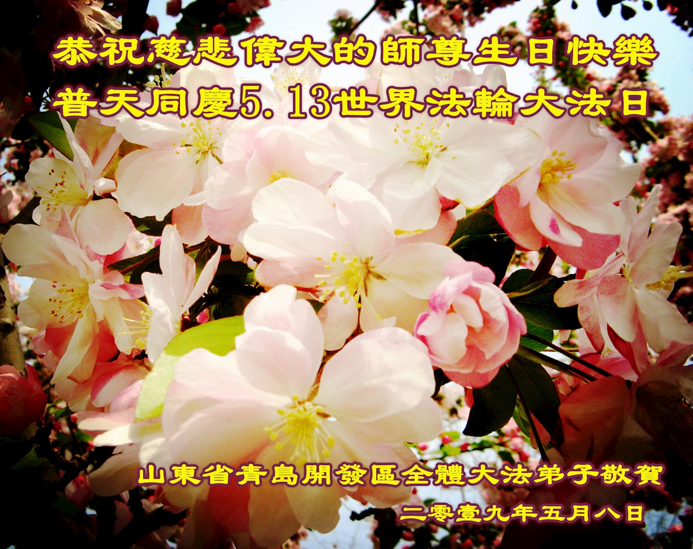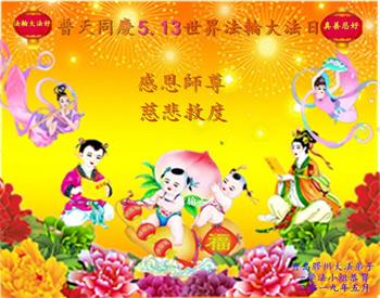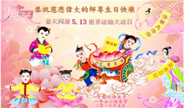 山东省青岛开发区全体大法弟子恭祝慈悲伟大的师尊生日快乐!暨普天同庆5.13世界法轮大法日! 山东省青岛一老年学法小组大法弟子恭祝师父生日快乐!