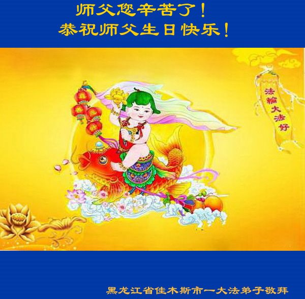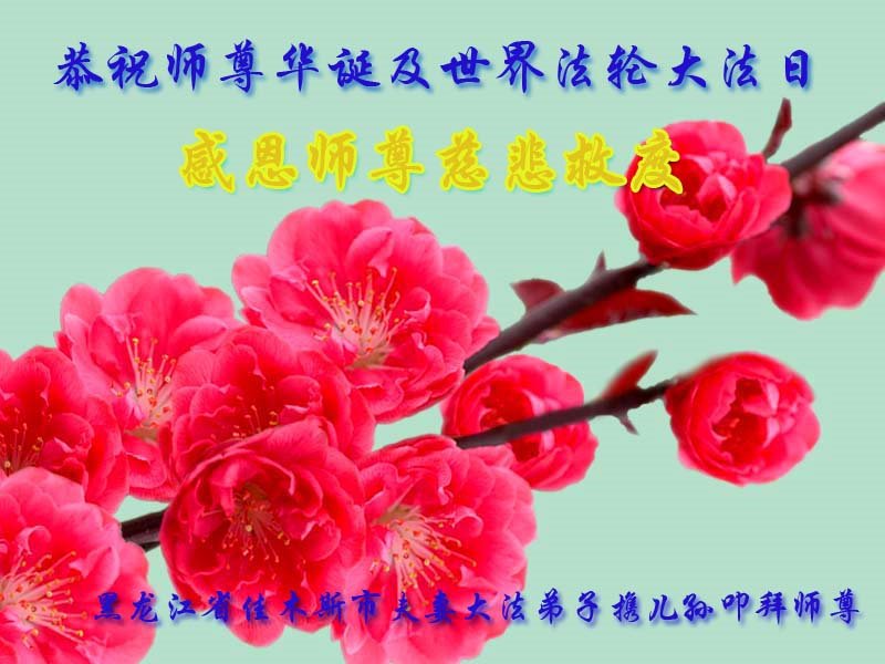 师尊您好!您辛苦了!又一次迎来世界法轮大法日,弟子千言万语表达不尽对您的感恩。是您的时时点悟和提醒,让我们在无比艰难的情况下义无反顾的走在修炼的大道上,您的威德震撼穹宇。在第二十届世界法轮大法日来临之际,我们夫妻弟子携儿孙叩拜您生日快乐!盼望您早日荣归故里。 黑龙江省佳木斯佳西区大法弟子恭贺法轮大法日!恭祝师尊生日快乐!