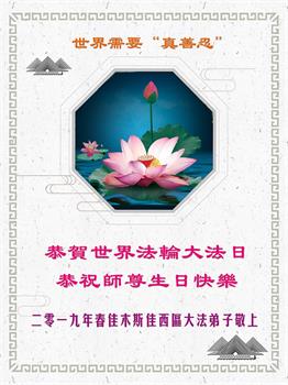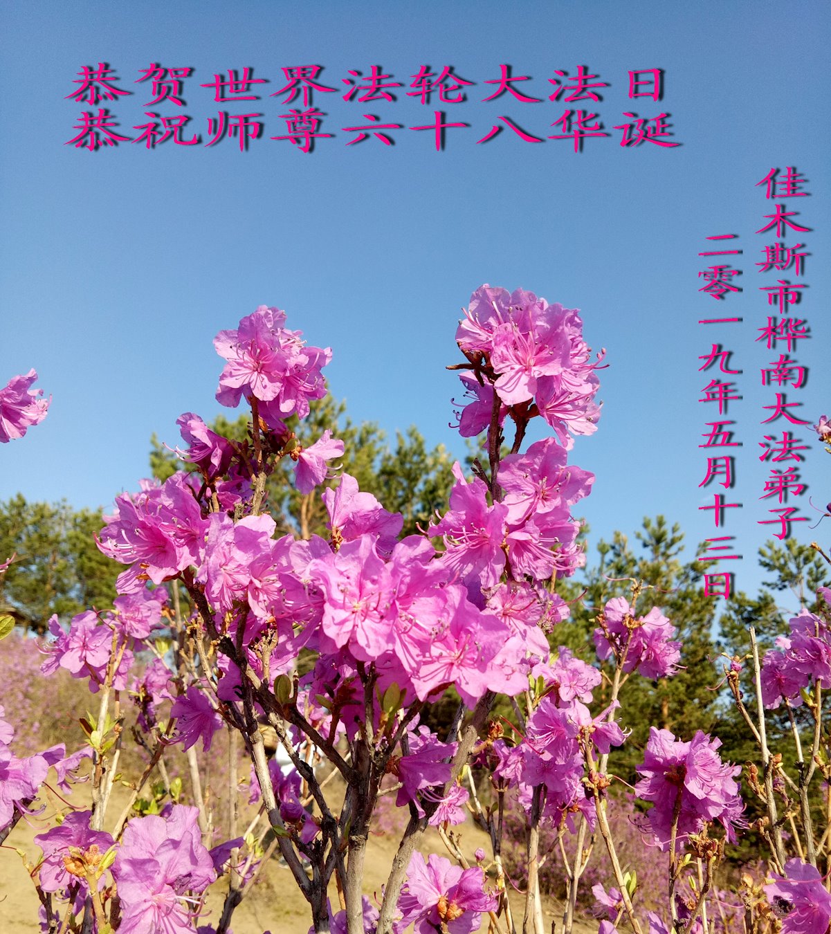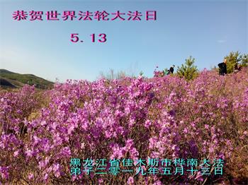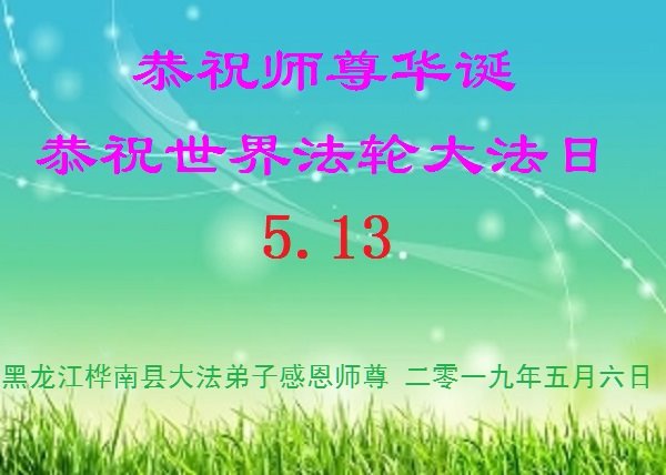 师尊传法 福满中华 亿万弟子 德盈天下 修炼无价 生命升华 思维开阔 目标远大 兑现誓约 助师正法 广救众生 拯救中华 感谢师尊 感谢大法 祝师快乐 永听师话 佳木斯大法弟子 2019.5.13。 黑龙江佳木斯大法弟子恭祝伟大师尊生日快乐!祝贺世界法轮大法日!