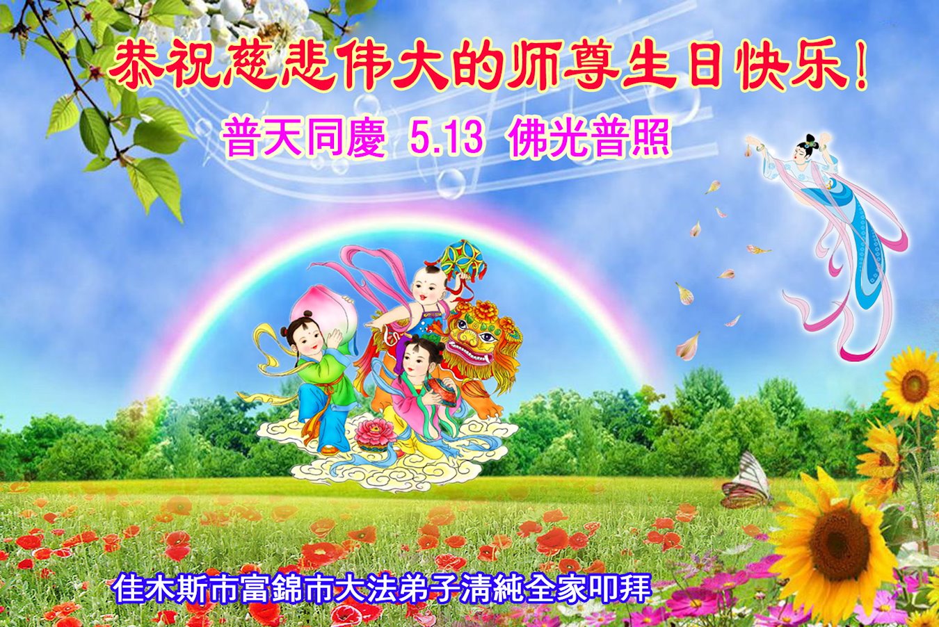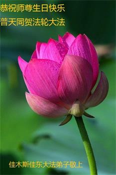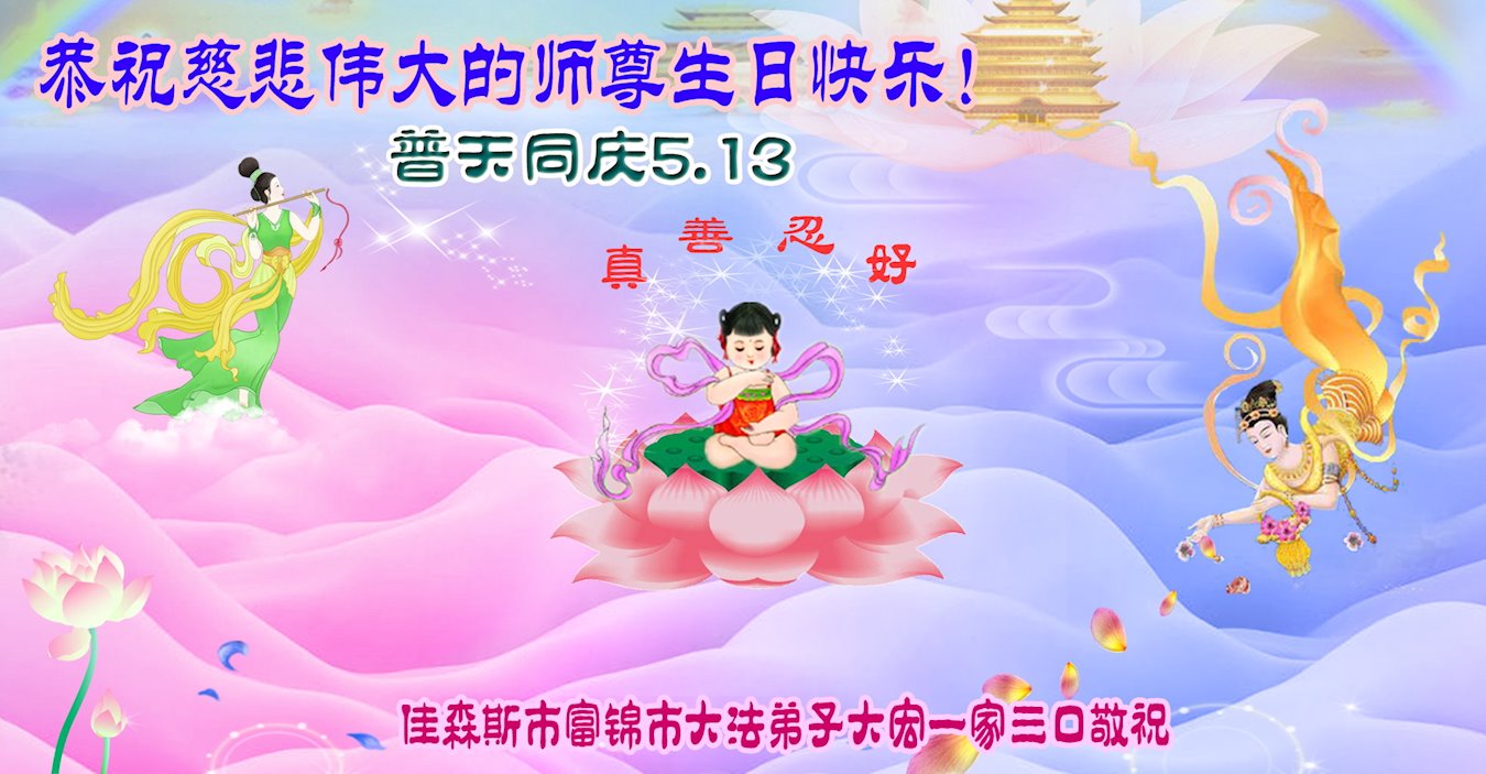 【明慧网二零一九年五月十一日】 黑龙江佳木斯市富锦市大法弟子一家三口恭祝慈悲的师尊生日快乐!