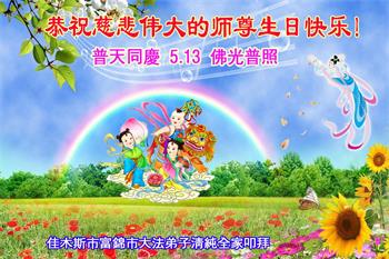 黑龙江佳木斯市富锦市大法弟子及家人恭祝师尊生日快乐!