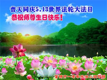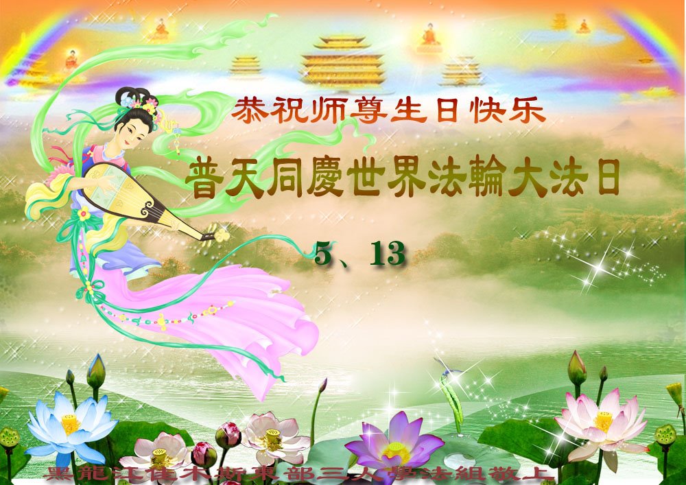 普天同庆5·13世界法轮大法日,弟子们恭祝慈悲伟大的师尊生日快乐!师父您辛苦啦!弟子们想念您! 黑龙江佳木斯华南大法弟子恭贺世界法轮大法日!
