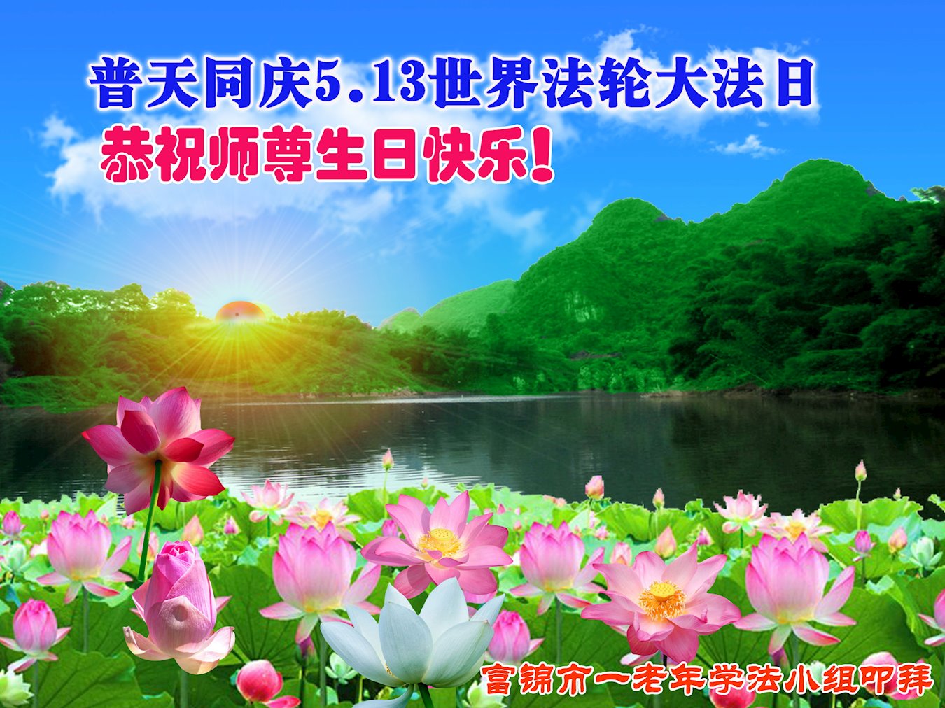黑龙江佳木斯市富锦市一老年学法小组大法弟子恭祝师尊生日快乐!恭贺法轮大法日!