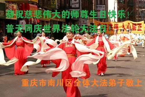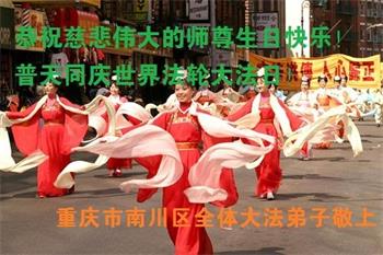 尊敬的师父您好!您辛苦了!弟子祝您生日快乐!弟子无论如何都不会辜负您的希望,紧跟正法進程,决不有负师恩。坚修大法,走好师父安排的路,圆满随师返。感谢师父的慈悲苦度! 重庆市南川区全体大法弟子恭祝慈悲伟大的师尊生日快乐!庆祝世界法轮大法日!