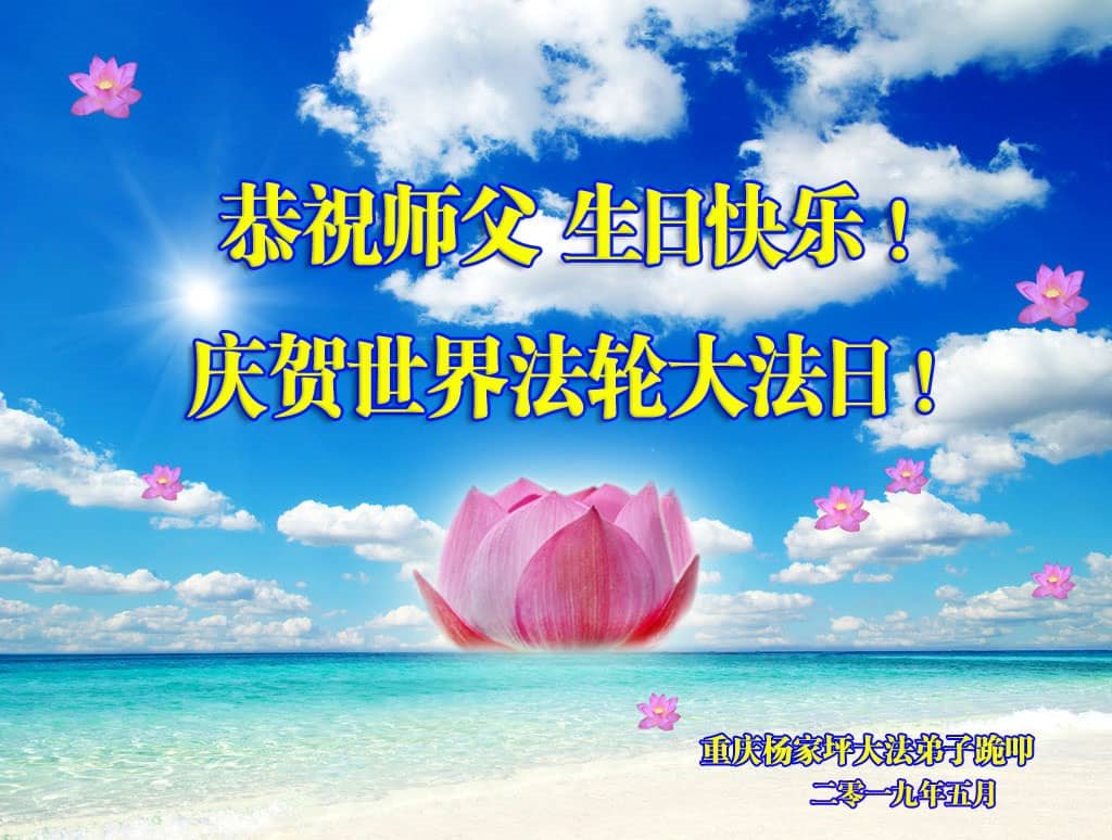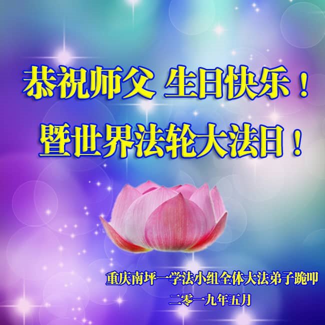 【明慧网二零一九年五月十一日】 重庆市沙坪坝区一大法弟子恭祝师尊生日快乐!普天同庆世界法轮大法日!