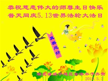 我们夫妻在这世界法轮大法日来临之际,祝师父生日快乐!我们夫妻同修比学比修,遇到矛盾向内找,坚持发真相资料救人,让有缘人得到资料,明白邪恶的谎言,得到救度,完成我们的使命,让师父多一些欣慰,少一些操劳。 湖北浠水大法弟子恭祝师父生日快乐!