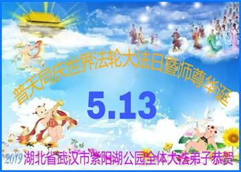 湖北随州大法弟子恭祝师尊生日快乐!普天同庆法轮大法日! 感恩师尊慈悲救度,用尽人类的语言也无法表达弟子对师尊的无限感恩,二十四年来师父为弟子操劳,使弟子在大法中获新生。弟子唯有听师尊教诲做好三件事,信师信法,修好自己,多救人以报师恩。 湖北随州大法弟子合十!跪拜! 2019年5月8日 湖北省武汉市紫阳湖公园全体大法弟子恭贺世界法轮大法日!暨师尊华诞!