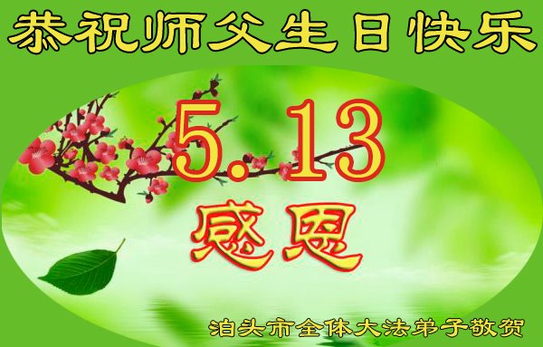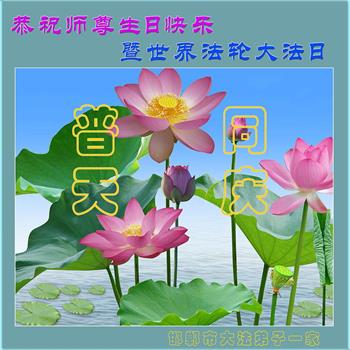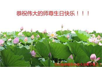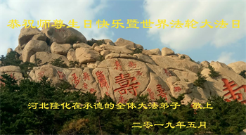 泊头市全体同修共同恭祝伟大的师尊生日快乐!祝贺世界法轮大法日!祝贺法轮大法洪传二十七周年! 在师尊的慈悲保护下,我们修炼的每一个日日夜夜,慈悲伟大的师尊无时无刻不在看护着弟子、保护着弟子,用大法的法理启悟我们,洗涤我们心中的污浊与杂念,使我们的本体不断向神体转化,教会我们如何做一个好人、一个更好的人,引导我们从为私为我的旧法理中超脱出来,在法光沐浴中,从法中认识法,修成无私无我、先他后我的正觉,不断纯净自己,同化真、善、忍。您赋予我们助师正法的伟大使命,给予我们正法时期大法弟子的伟大称号,法理上在不断的提高,心性上不断的升华,特别是在过关过难时,我们都有一个共同的信念:师父无所不能,大法无所不能。不管遇到多大的魔难,在信师信法中闯过来了。 总之,感受最深的是:师父给了我们太多太多!千言万语,万语千言,也难以表达对师尊的感恩!师父啊!弟子们将如何报答您的无上恩赐与浩荡洪恩?!苍天大地为书,抒不尽师尊师恩浩荡;江河之水为墨,道不尽大法救度洪恩。弟子们唯有精進再精進,多学法、多救人,修炼好自己,从法上真正提高上来,形成坚不可摧的整体,让师尊多一份欣慰,少一份操劳! 泊头市全体大法弟子叩拜师尊! 河北衡水一学法小组大法弟子恭祝师尊生日快乐!祝贺世界法轮大法日!