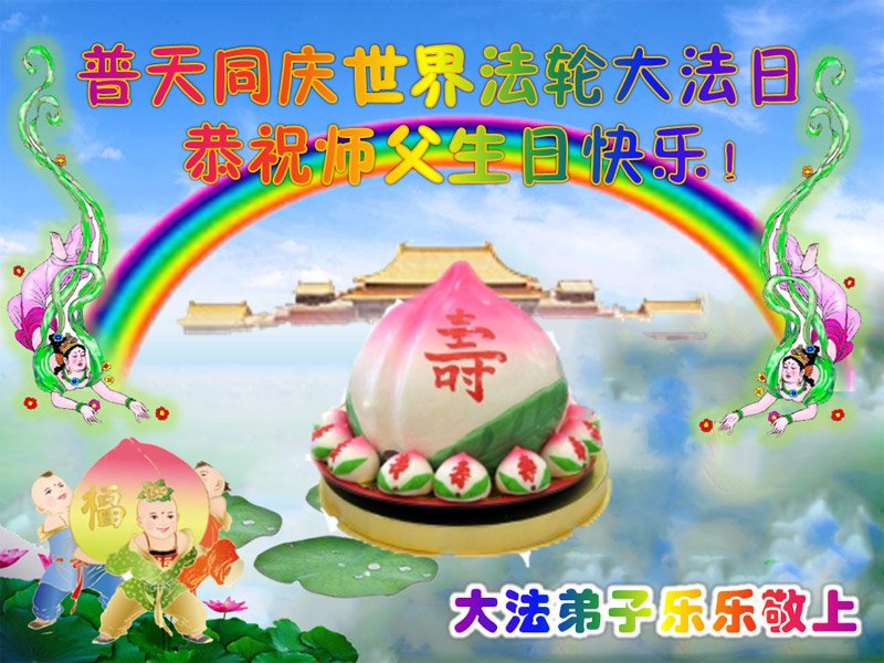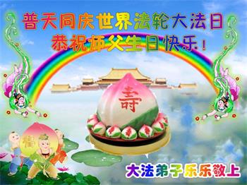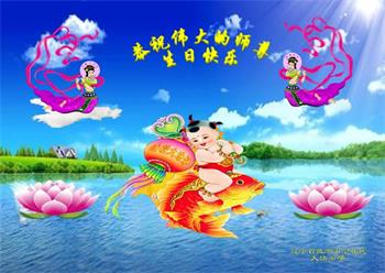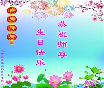 世界法轮大法日和师父生日到来之际首先祝师尊生日快乐!师父辛苦了,感恩师父二十年来对弟子慈悲保护!师父用最大承受来延续每一天,特别是弟子被迫害时,师父点悟着弟子,弟子用正念走出魔窟,弟子无法用语言表达只能用强大正念配合好整体,做好三件事,学好法,修好自己,坚信大法,完成史前誓约, 圆满跟师尊回家。 辽宁省鞍山市大法弟子恭祝师父生日快乐!恭祝法轮大法日!