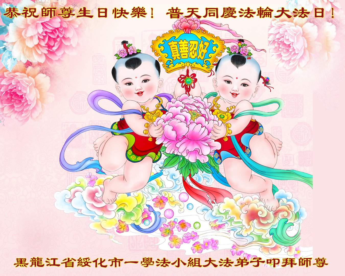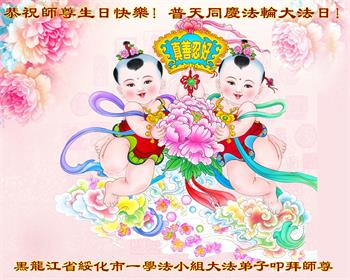恭贺世界法轮大法日!暨师尊华诞 黑龙江省绥化市绥棱县一学法小组大法弟子恭祝慈悲伟大的师尊生日快乐! 黑龙江省牡丹江市宁安市大法弟子恭祝师父生日快乐!恭贺世界法轮大法日!