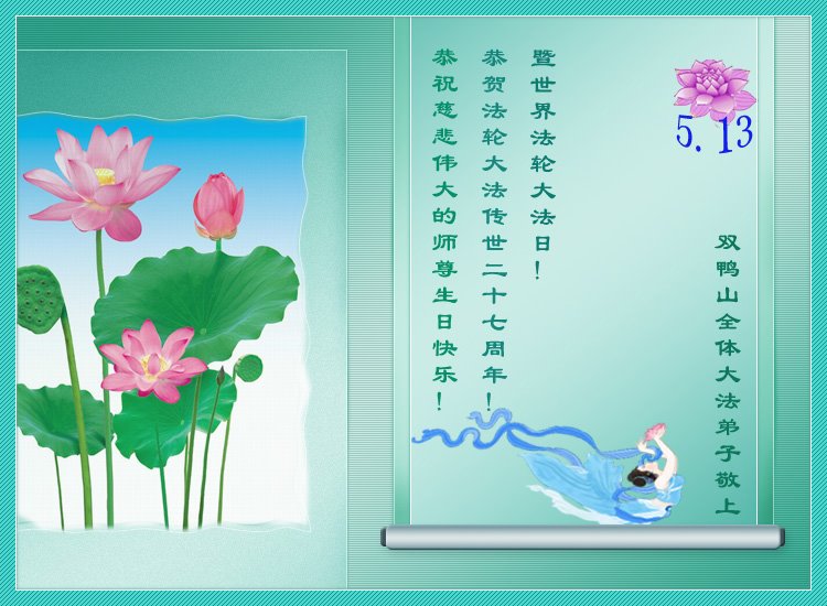 黑龙江省双鸭山市全体大法弟子恭祝慈悲伟大的师尊生日快乐!恭贺法轮大法传世二十七周年暨世界法轮大法日! 黑龙江省双鸭山市大法弟子恭祝师父生日快乐!