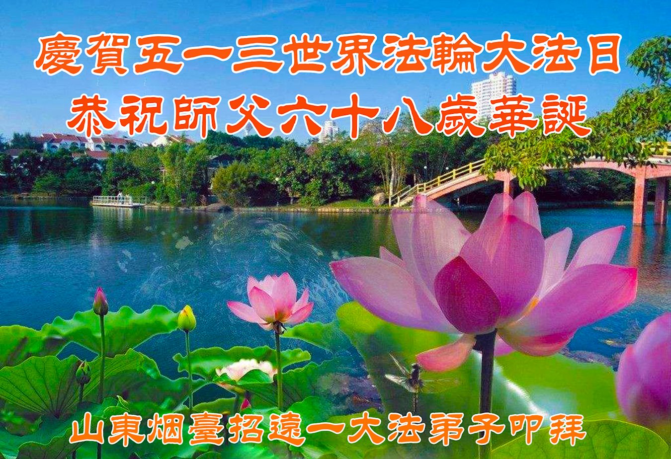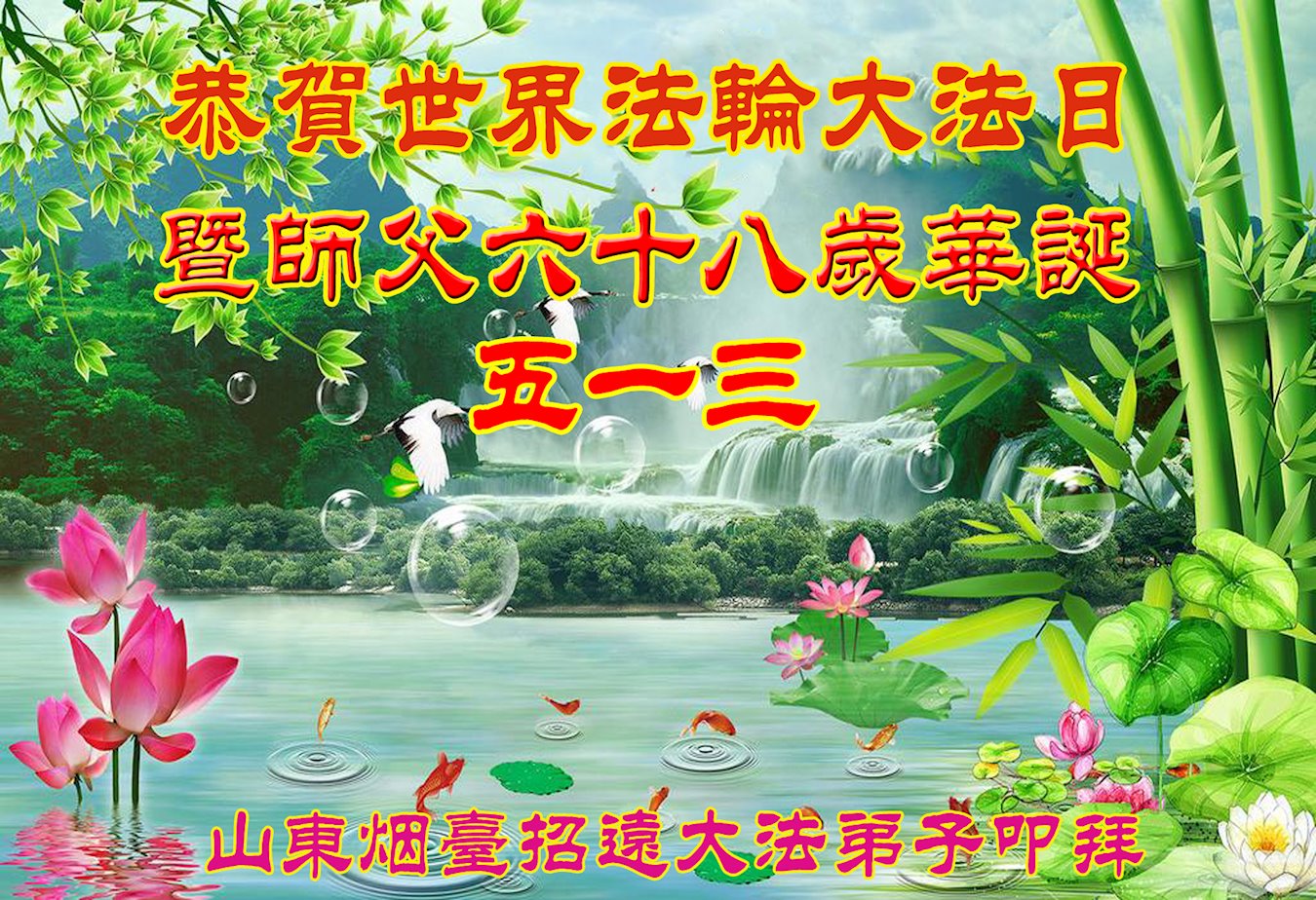 在这全世界法轮大法日的大喜日子里,弟子怀着无限感恩的心情,向慈悲伟大的师父问好! 恭祝师父生日快乐!千言万语道不尽弟子和众生的感恩之心,唯有精進实修,多救人,才能不愧对师恩。 山东省淄博市淄川区老年大法弟子恭贺法轮大法日!