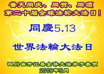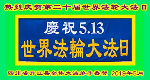 5.13世界法轮大法日!和慈悲伟大的师尊生日日渐临近,四川省仪陇县全体大法弟子借助明慧网热烈庆祝世界法轮大法日的到来,同时叩拜恭祝师尊生日快乐!感恩师尊在二十七年前的五月十三日将宇宙大法法轮佛法洪传于世,福泽万物众生!弟子们无以为报,唯有学法入心,修正一思一念一言一行,抓紧救人,才不负师尊的慈悲苦度与渴望得救的众生的期盼。 再次恭贺世界法轮大法日的到来!恭祝师尊生日快乐! 四川省仪陇县全体大法弟子 二零一九年五月七日 四川省达州市开江县全体大法弟子热烈庆贺第二十届世界法轮大法日!