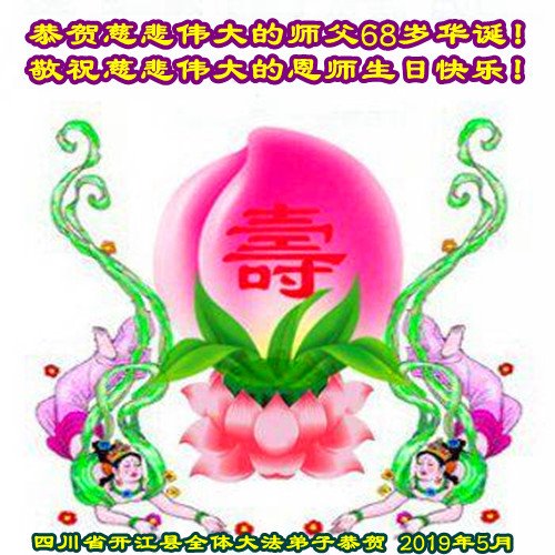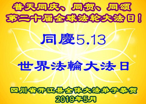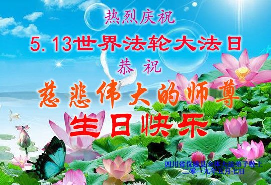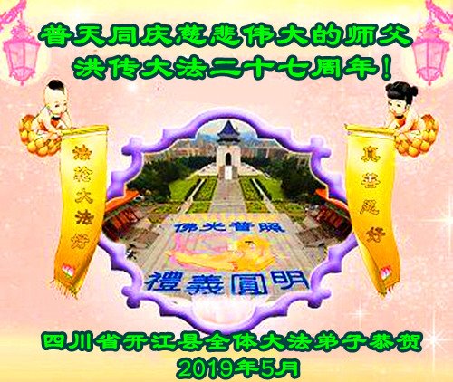 庆祝五一三世界法轮大法日、法轮大法弘传世界二十七周年! 徒儿们谨记师尊法理多学法、学好法,做好“三件事”,抓紧救度更多的有缘人,回报师尊的慈悲苦度之恩,请慈悲的师尊放心! 徒儿们跪拜叩谢慈悲伟大的师尊! 四川乐山全体大法弟子敬上! 2019 年5月7日 四川省达州市宣汉县大法弟子恭祝师父生日快乐!恭贺“五▪一三”世界法轮大法日!