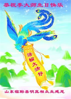 【明慧网二零一九年五月十一日】大陆各地大法弟子和他们明白真相的亲朋好友真诚的恭祝慈悲伟大的大法师尊华诞暨世界法轮大法日! 山东省潍坊市临朐县明真相世人恭祝李大师华诞快乐!