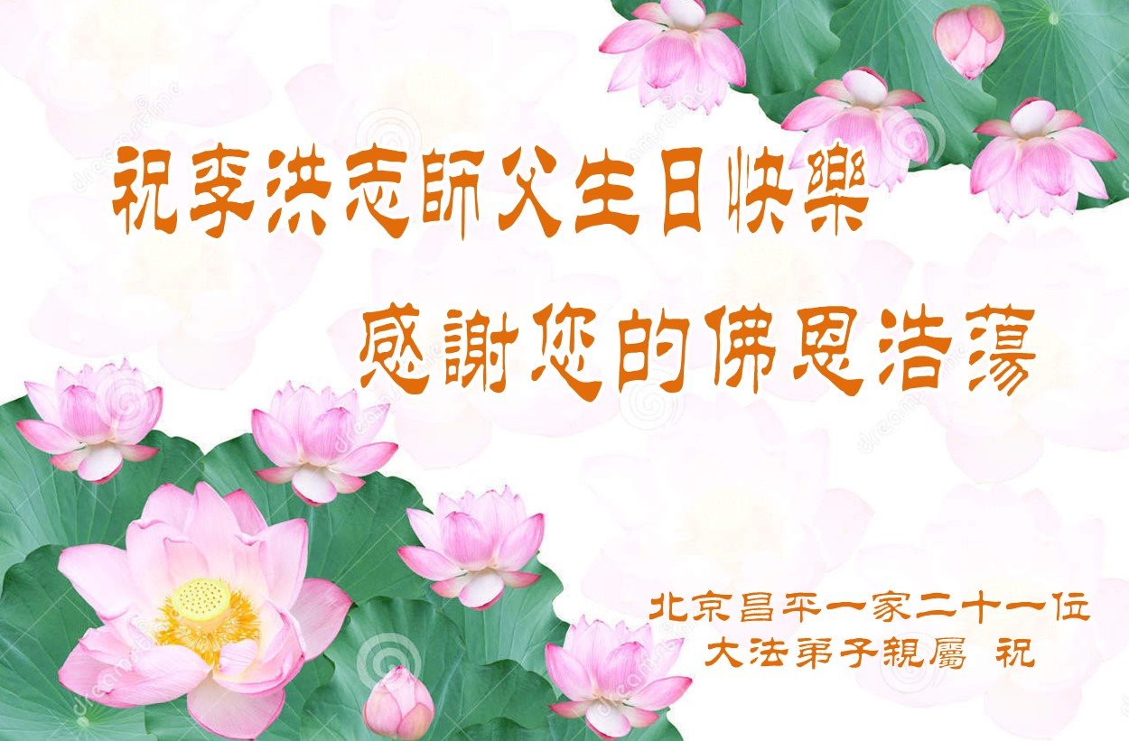 师父您好:弟子及明真相的家属恭祝您生日快乐!同庆世界法轮大法日!师父您辛苦了!谢谢您慈悲救度!弟子们谢恩!谢师恩! 北京昌平一家二十一位大法弟子亲属恭祝李大师生日快乐!