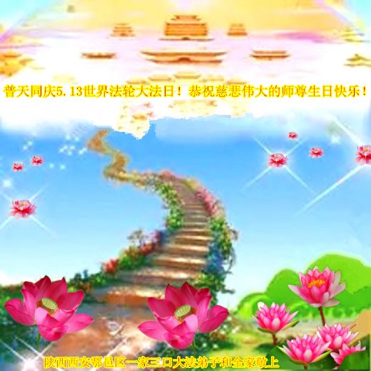 恭祝慈悲伟大的师尊生日快乐! 陕西省西安市鄠邑区一家三口大法弟子和全家人恭贺5.13世界法轮大法日!恭祝慈悲伟大的师尊生日快乐!感谢师尊的慈悲苦度!弟子唯有精進实修报师恩。 陕西西安大法弟子恭祝师尊生日快乐!