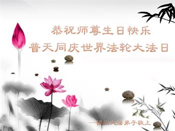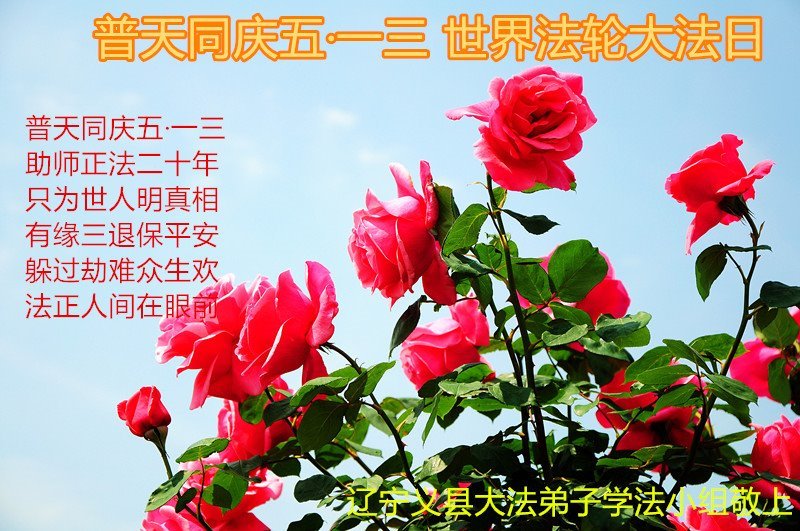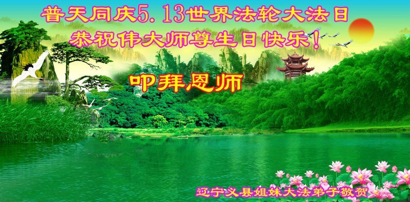 在即将来临的师尊华诞和“5.13”世界法轮大法日双喜临门的大喜日子里,弟子恭祝慈悲伟大的师父生日快乐!祝全世界大法弟子更加勇猛精進!得法四年来,弟子时刻感受到师尊就在弟子身边一路精心看护,慈悲点悟,师尊为我们几乎耗尽了一切,为我们操尽了心,弟子唯有用心做好三件事,和同修圆容好,精進、精進、再精進,来回报师尊,惟愿师尊笑! 辽宁锦州汤河子大法弟子一学法小组大法弟子恭祝慈悲伟大的师父生日快乐!谢谢师父慈悲苦度!