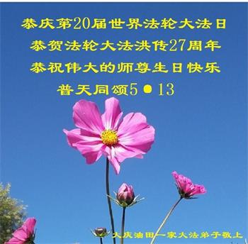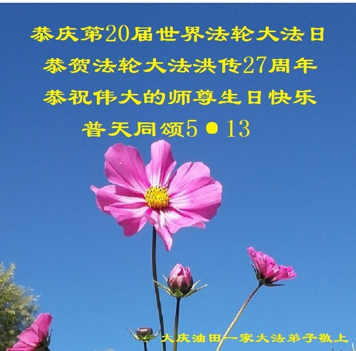 黑龙江省大庆油田一家大法弟子恭庆第20届世界法轮大法日!恭贺法轮大法洪传27周年!恭祝慈悲伟大的师尊生日快乐!