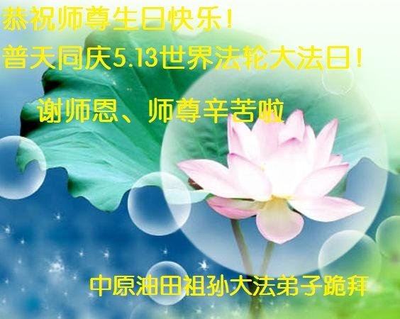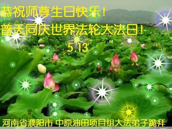 全体大法弟子跪拜恭祝师尊生日快乐! 河南省濮阳市5县一区、中原油田 全体大法弟子跪拜恭祝师尊生日快乐!普天同庆5.13世界法轮大法日! 师父辛苦了,谢谢师父慈悲救度,我们一定会做好三件事,让师父少一点操劳,多一点温馨。 中原油田祖孙大法弟子跪拜恭祝师尊生日快乐!